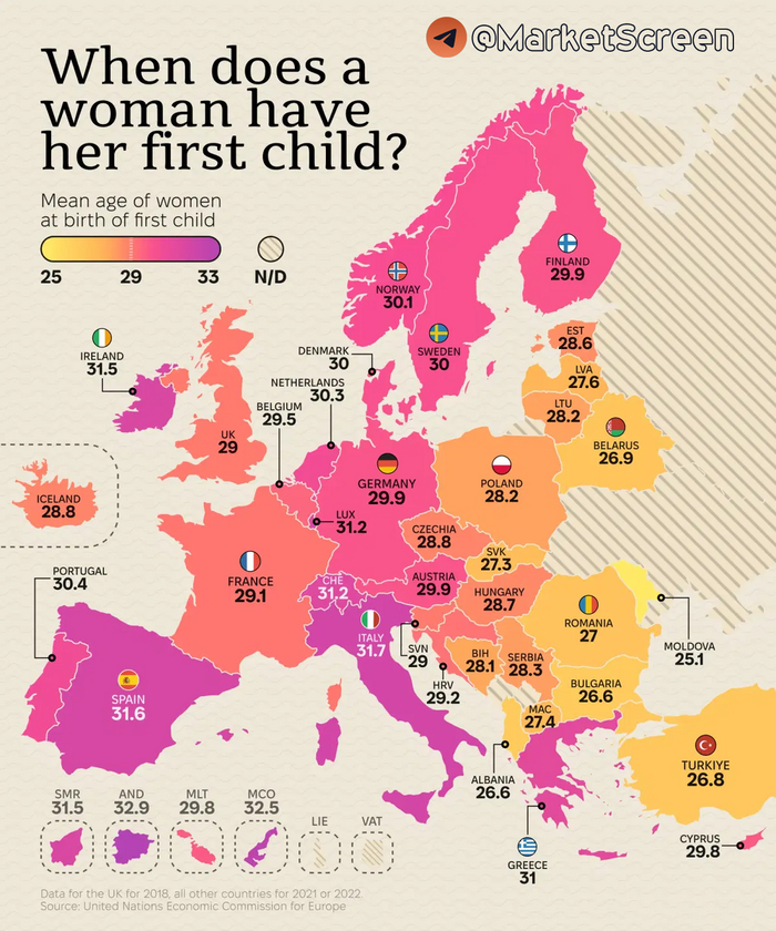 В среднем. По Европе. Складывается ощущение, что имеется связь между увеличением возраста и развитие страны. Разве что Греция выбивается из списка.