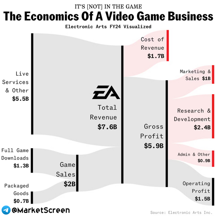 Но в 2024 году затраты для потребителей редко прекращаются после покупки игры. Настоящим финансовым двигателем EA является сегмент "живых сервисов" — широкий термин, охватывающий продажу дополнительного контента, подписки, внутриигровые награды и другие цифровые ништяки. В прошлом году на это пришлось 73% выручки компании.