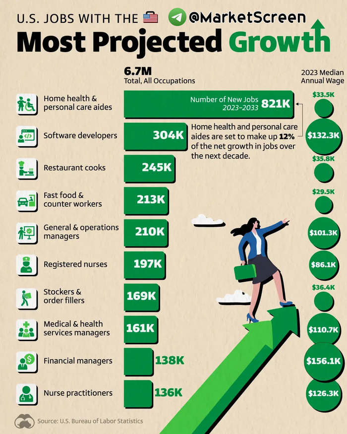 Ожидается 821 тысяча новых рабочих мест для сиделок. По итогам 2023 их медианная годовая зарплата достигла 33,5к$