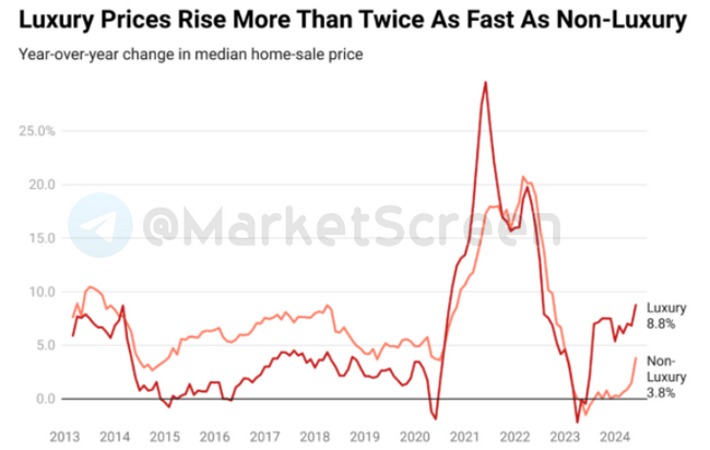 - Продажи элитного жилья выросли на 0,2%, в то время как продажи домов, не относящихся к классу люкс, упали на 3,4% до самого низкого уровня за десятилетие.