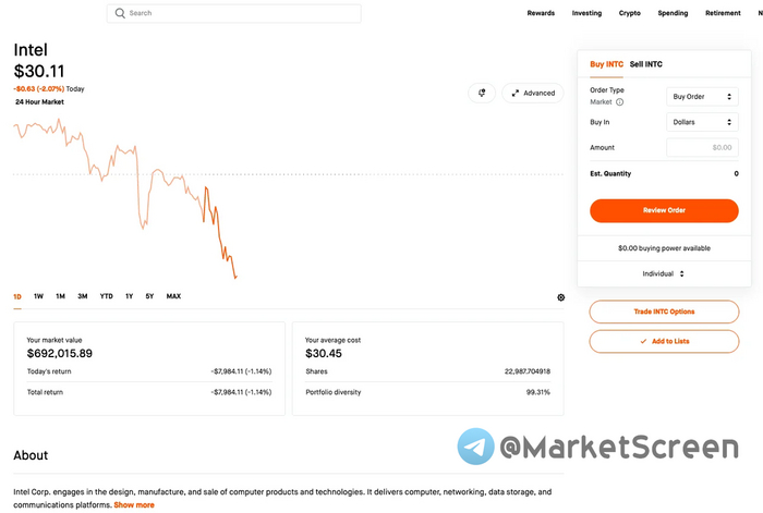 1,2 миллиона долларов потеряно в акциях Интел! Никакой торговли, никакого плеча. Тупо инвестирование. Тупо удержание акций в течение 3,5 лет.