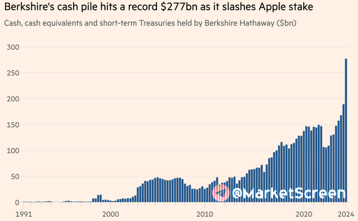 Продажи акций привели к тому, что денежные средства Berkshire достигли рекордного уровня в $277 млрд, что на $88 млрд больше, чем в предыдущем квартале. Компания вложила эти средства в краткосрочные казначейские облигации.