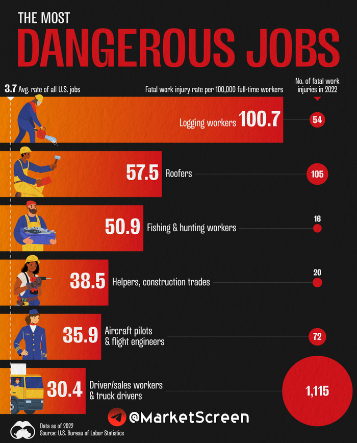 На этом графике представлены шесть профессий в США с самыми высокими показателями производственного травматизма со смертельным исходом на 100 000 работников, занятых полный рабочий день, в 2022 году.