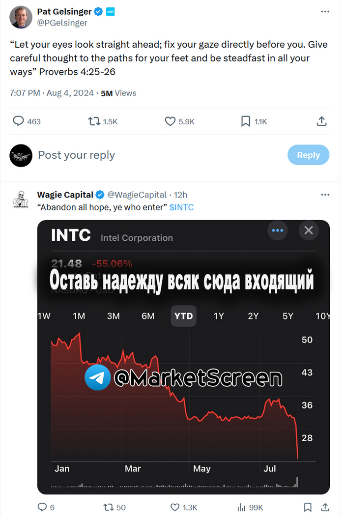 Я верил в вас! Я купил акции Интел по 54$, когда вы стали директором в 2021 году. Я всегда даю новому руководству 3-5 лет на раскрутку, прежде чем делать какие-то выводы. Прошло 3,5 года. Дело идут не очень. Каждый квартал вы говорили, что дно достигнута, но в следующем квартале всё оказывалось хуже.