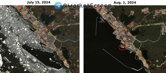 Судно представляет собой судно длиной примерно 280 метров, пришвартованное к причалу Arctic LNG 2 примерно 1 августа, что почти соответствует длине обычного судна используемого для перевозки СПГ. На спутниковом снимке также видно пламя на близлежащем объекте, что, вероятно, означает, что там газ и, возможно, наращивают производство СПГ.