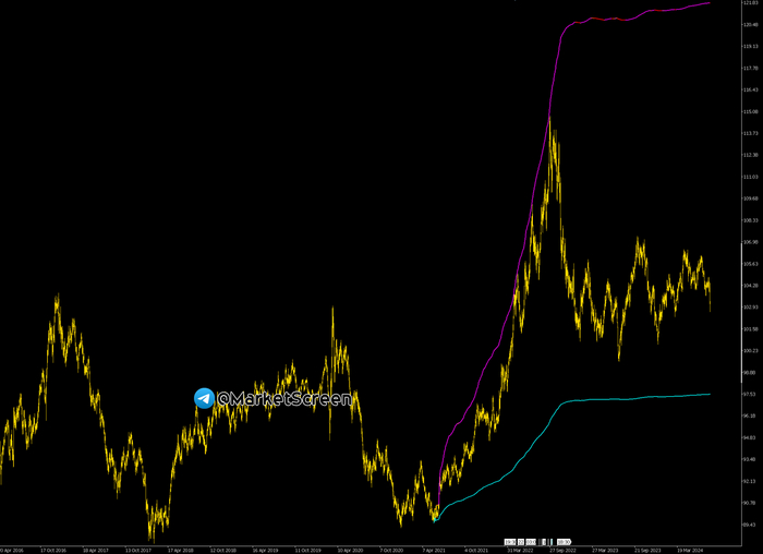 Если расширить историческую перспективу несколько далее вчерашнего дня, то картина получается вот такая. Индекс доллара практически в самой середине самой середины. Забейте.