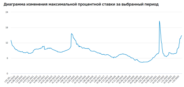 Динамика максимальной процентной ставки (по вкладам в российских рублях) десяти кредитных организаций, привлекающих наибольший объём депозитов физических лиц