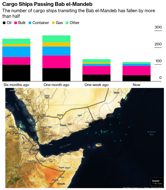 Число судов, проходящих через Баб-эль-Мандеб с пятницы, сократилось более чем наполовину по сравнению с соответствующим периодом месяцем ранее, свидетельствуют данные, отслеживаемые агентством Bloomberg.