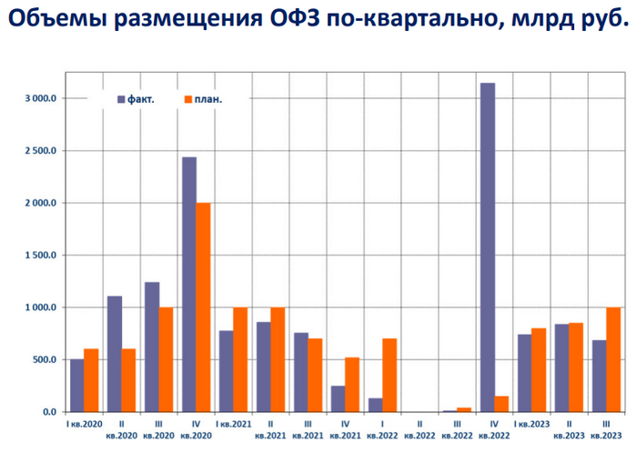 Спрос на первый выпуск был небольшим. менее чем в два раза выше размещенного. А вот второй выпуск уже возжелали приобресть на 84,2 млрд ₽. План по квартальному размещению в данный момент не выполняется. Остался один аукционный день. Но, судя по тому, что Минфин не бежит занимать по любым предложенным ему ставкам, надо понимать, что серьезных проблем с ликвидностью у него нет.