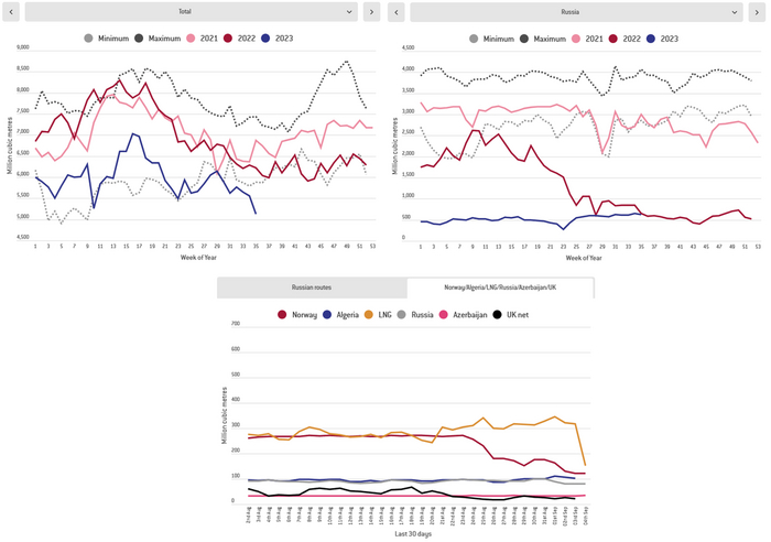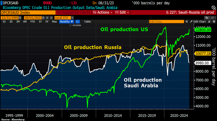 Картина добычи нефти по трём основным поставщикам - США, Россия, Саудовская Аравия.