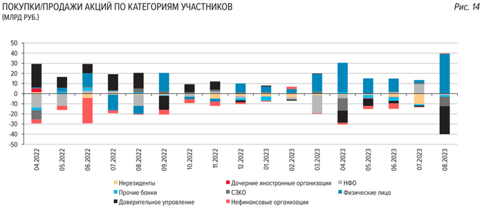 Физические лица существенно нарастили объемы нетто-покупок, приобретя за месяц акций на общую сумму 39,2 млрд руб. (в июле – всего на 2,9 млрд руб.), что составило 98% всех нетто-покупок (в разрезе категорий участников). Такой объем покупок стал максимальным с февраля 2022 г. и близок к показателям 2021 года. В 2021 г. среднемесячный объем нетто-покупок физическими лицами акций на биржевом рынке составлял 46,4 млрд рублей.