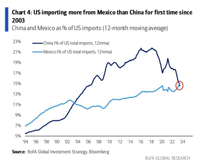 США теперь импортирует из Мексики больше, чем из Китая, чего не было уже 20 лет. Китайская доля в импорте США снижается вот уже как 5 лет. С 22% до 14%. Однако...