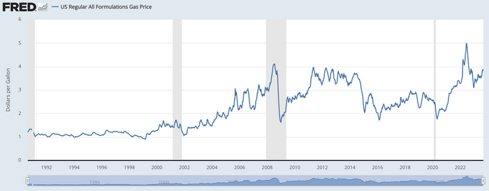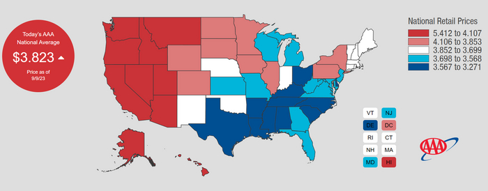 Ну как-то так. Это Regular, т.е. 92-й. Усредненка по 900 заправкам. 3,807$ за галлон. Галлон в США - 3,785 литра.