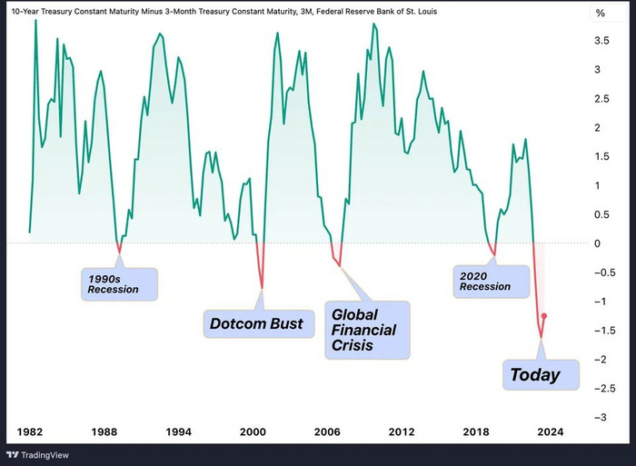 К примеру, тут у нас разница доходностей 10-леток и 3-месячных бумаг. Она рекордная.