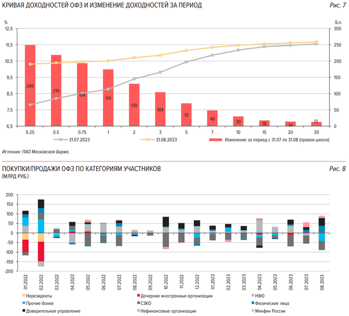 Однако в начале сентября произошёл дополнительный рост доходностей на сроках 1-5 лет. А это указывает на ожидание сохранения текущего уровня ключевой ставки существенное время.