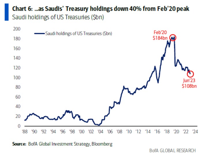 Саудиты льют американские трежеря. С пика, показанного в феврале 2020, по июнь 2023 избавились от 40% активов.