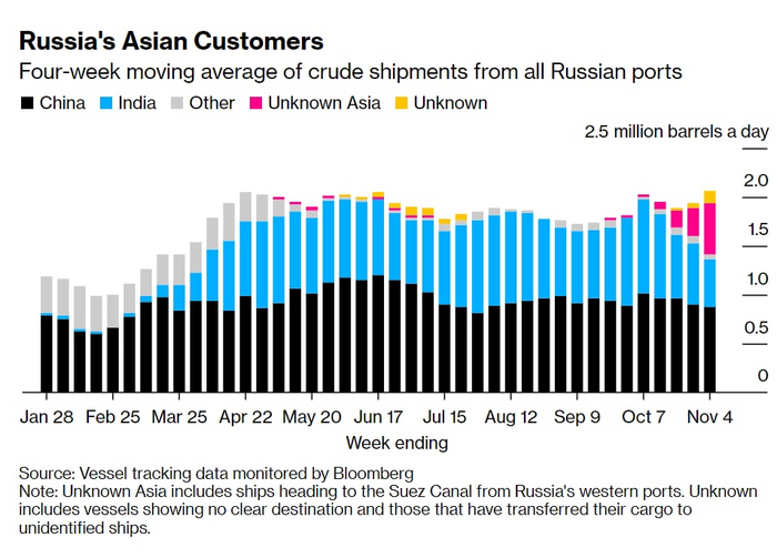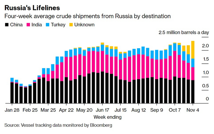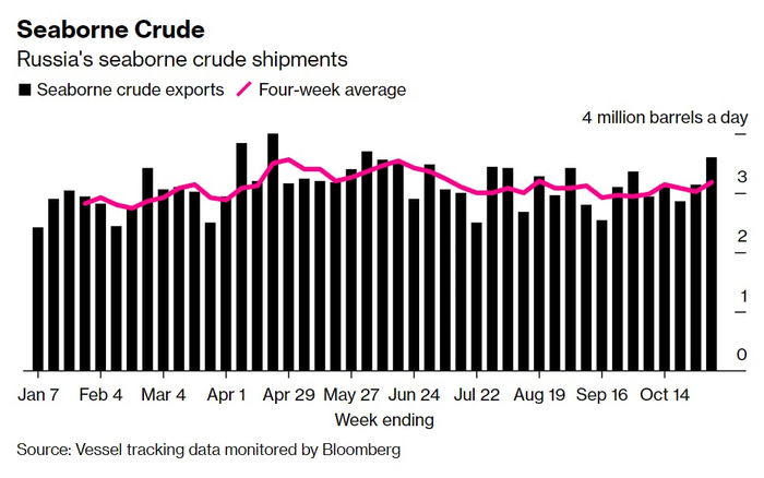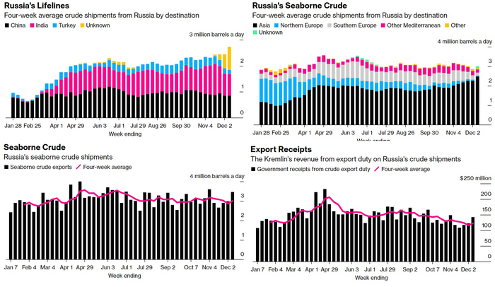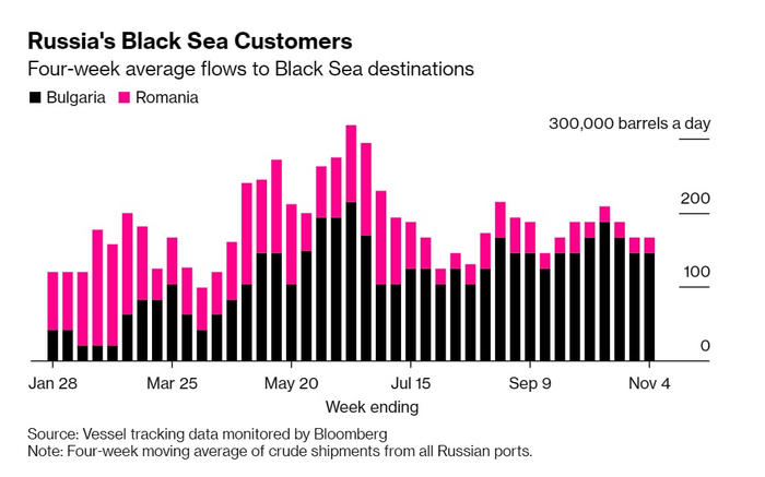 Они отслеживают нефть, покидающую 4 главных западных порта РФ - Приморск, Усть-Луга, Мурманск и Новороссийск.