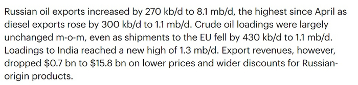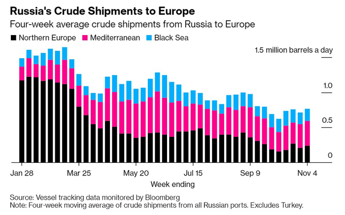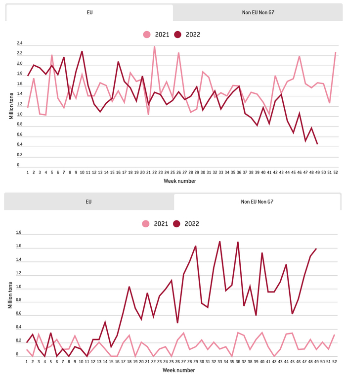 А вот вторая интереснее. Видно, как в течении года "европейские" объемы постепенно уходили. И ушли примерно на 1,2 млн.т./нед. А вот объемы вне ЕС/G7 выросли на 1,4 млн.т./нед.