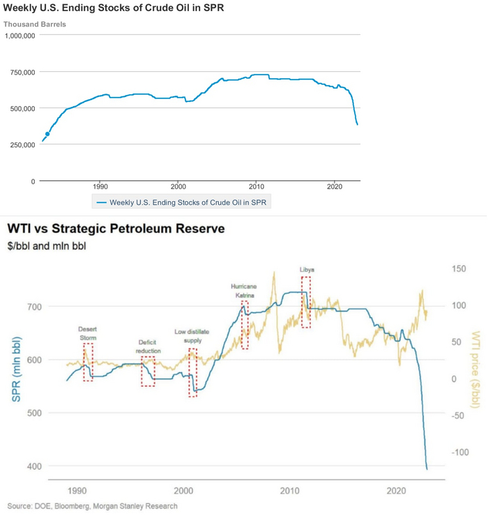 На второй картинке совмещены объемы Стратегического нефтяного резерва США и цены на нефть.