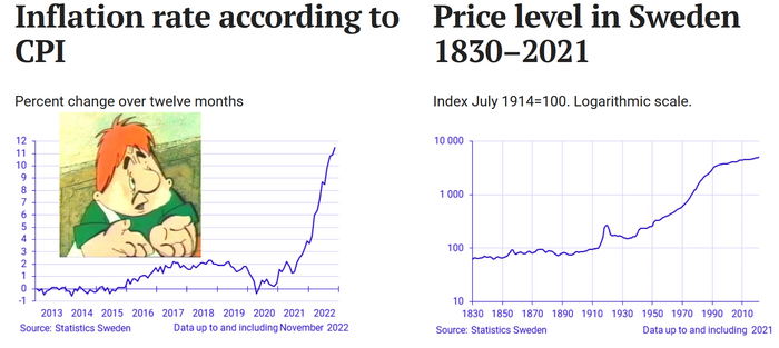 В Швеции инфляция продолжает расти. И вроде как даже уже за 11%. Что ни говори, а скандинавы - это самый громкотрескающийся шаблон для отечественного обывателя.