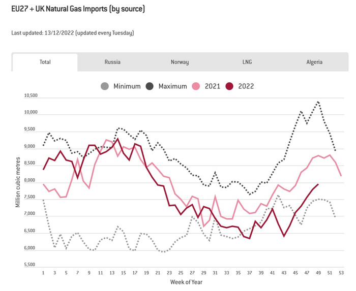 Первая картинка - недельные данные. Последняя неделя - окончившаяся 11.12. Пока всё в норме. И даже больше, чем в 2021.