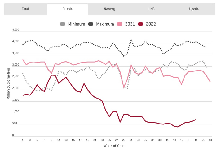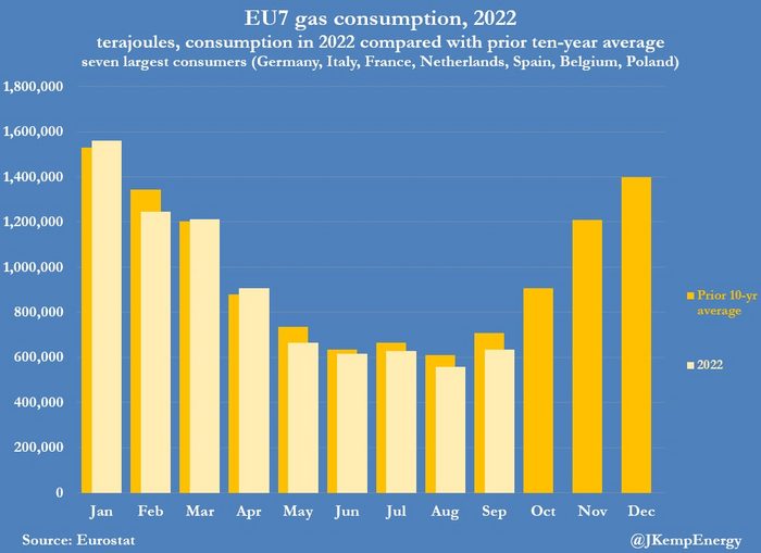 И вот это уже очень красивое. Понятно, что есть еще регулярное снабжение и прочее. Но тем не менее. Пока всё норм у Австрии и Латвии - они смогут тупо на хранилищах потусить годик. А вот, к примеру, у ВЕЛИКОбритании всё прекрасно - в газохранилищах всего 0,96% годового потребления.