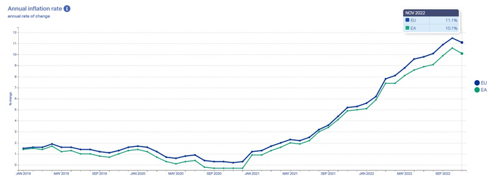 По итогам ноября инфляция в Евросоюзе и Еврозоне, а точнее её рост, замедлился. Первый такой случай за полтора года.