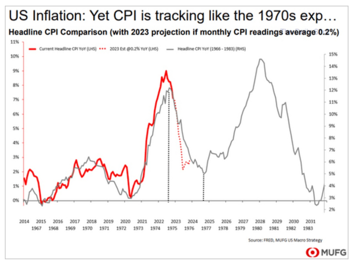 Вот, к примеру, инфляция США сейчас и в период 70-х годов. Пока движемся очень похоже. Если все так, то в 2024 года американцев ожидает снижение инфляции до целевого уровня в 2% и дальше подъем к 2028 на 10%. Поглядим...