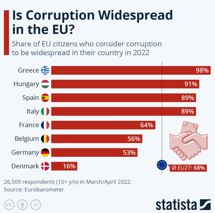 Сервис Statista выложил результаты опроса европейских граждан на предмет - распространена ли коррупция в вашей стране?