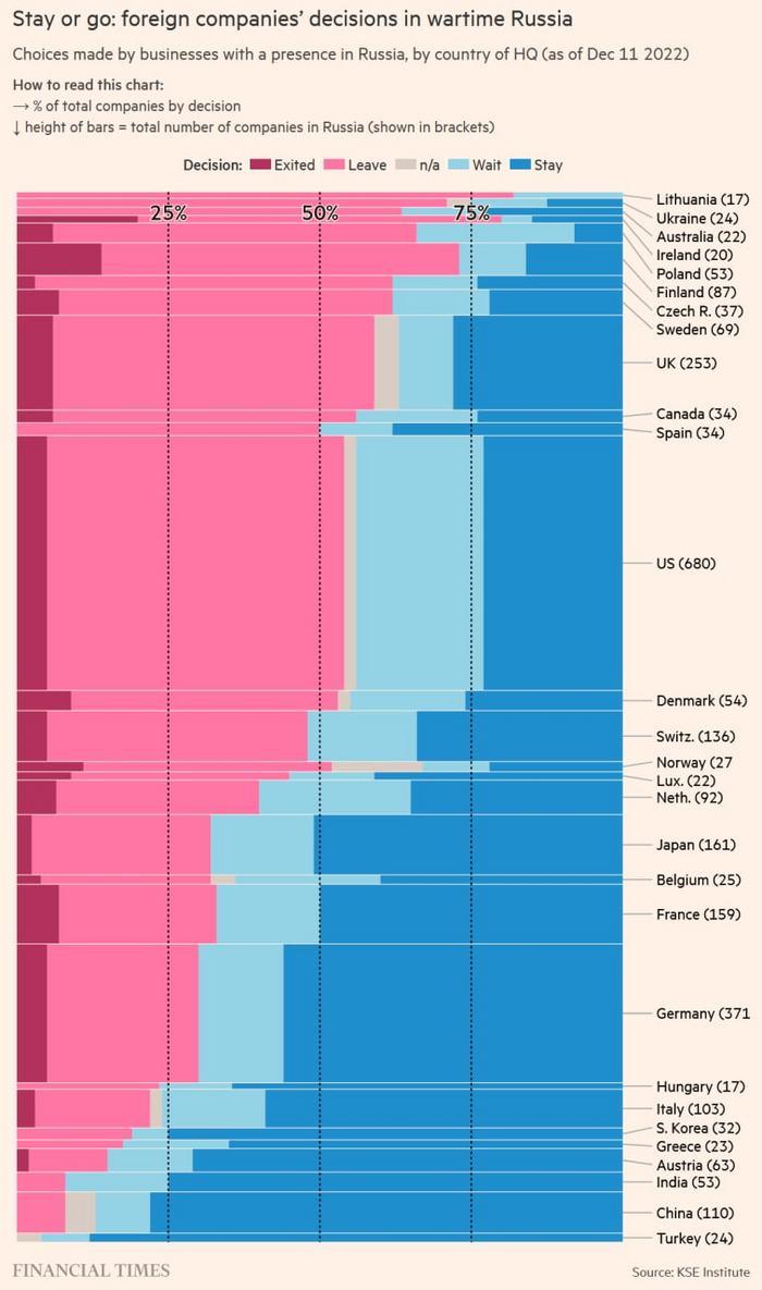 Financial Times опубликовал большую статью про наши финансовые элиты и их взаимодействие с Президентом до и после начала СВО. Очередной "глубокий" западный анализ на основе "один из друзей (источников в окружении) сказал". Ничего интересного. Кроме... инфографики по иностранным конторам в РФ.