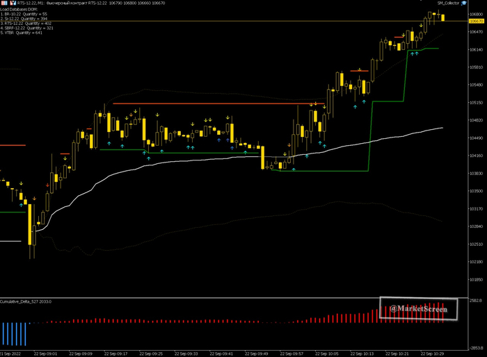 - по индикатору кумулятивной дельты (нижнее окно) оцениваем направление сделки. Индикатор выше нуля - только лонги. Ниже - шорты
