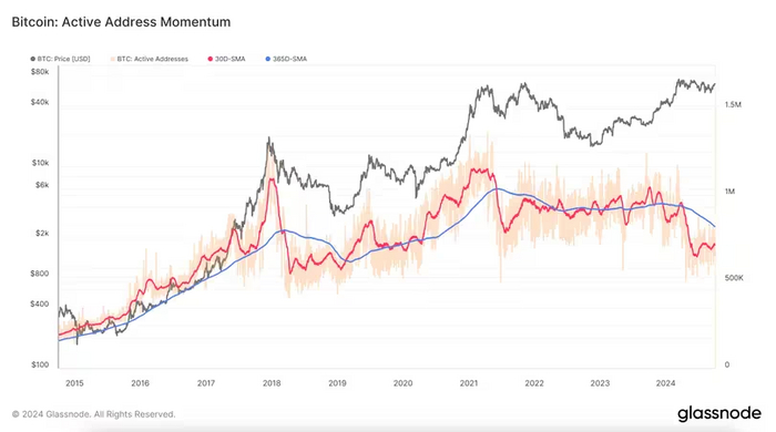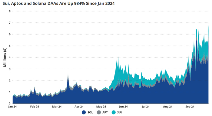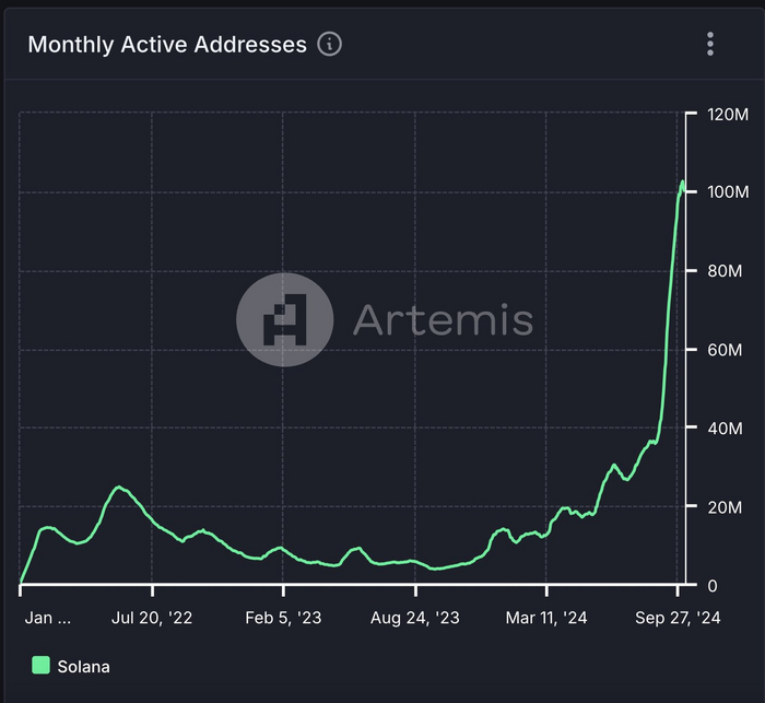 Во-вторых, за счет высокой скорости обработки транзакций и сверхнизких комиссий Solana продолжает привлекать новых пользователей. Мания на мемкоины привела к взрывному росту активных адресов, которые в месячном исчислении недавно превысили порог в 100 млн.