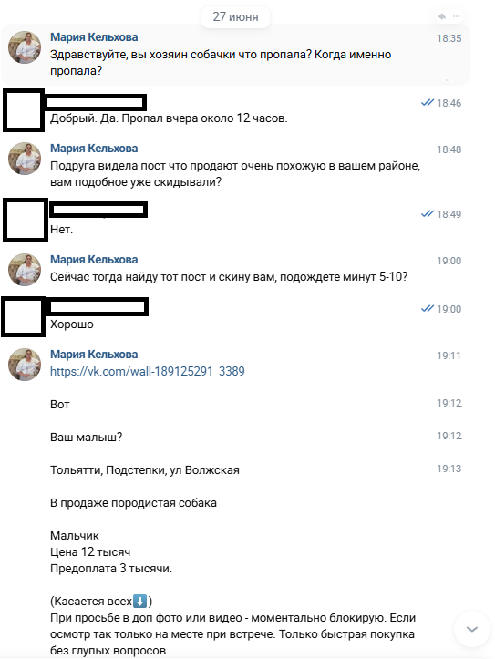 Естественно автор поста о продаже сразу же отвечает и прямо требует какие то предоплаты, и вообще уже едет усыплять (загоняют в стресс, не давая времени на раздумья, нагнетая обстановку)