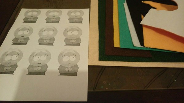 Приклеиваем это на клеевой фетр, рядом Картман, он уже был почти доделан: