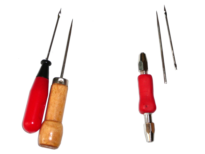Решил сделать универсальный ремнабор. Купил шило и шило с крючком, но был недоволен, что много места занимают ручки. Без дела валялся цангодержатель, решил его использовать в качестве универсальной ручки. Облепил держатель полимерной глиной и запёк, иначе неудобно удерживать. Вот что получилось: