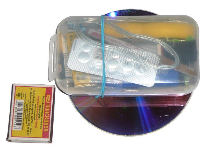 Так как оставалось место, дополнил набор небольшой отверткой с набором бит, мотками изоленты и сантехнического скотча и таблетками для обеззараживания воды.