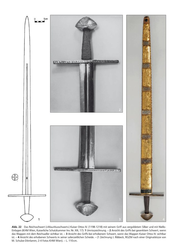 На клинке меча выгравированы гербы княжеств, принадлежавших роду Габсбургов. При этом, 4 герба были нанесены на клинок "авансом", т.к. эти княжества на момент вручения меча принцу еще не принадлежали королевскому дому Габсбургов.