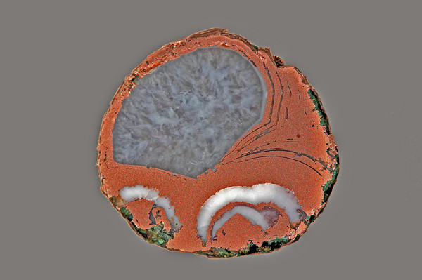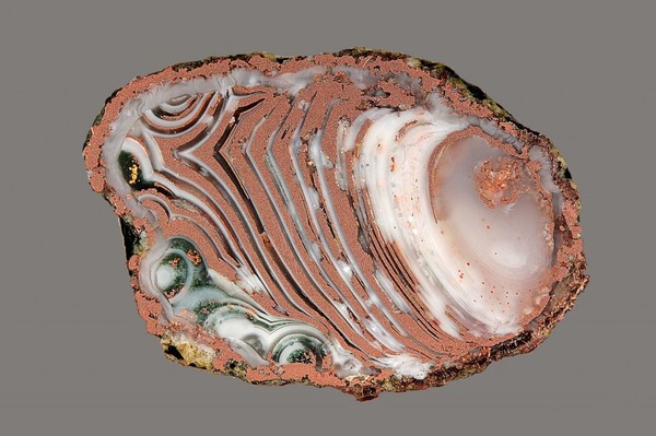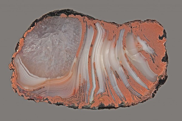 Расплавленная медь, попавшая на агаты, заменила халцедоновые полосы таким образом, что медь покрыла эти агаты сверху, как мантия.