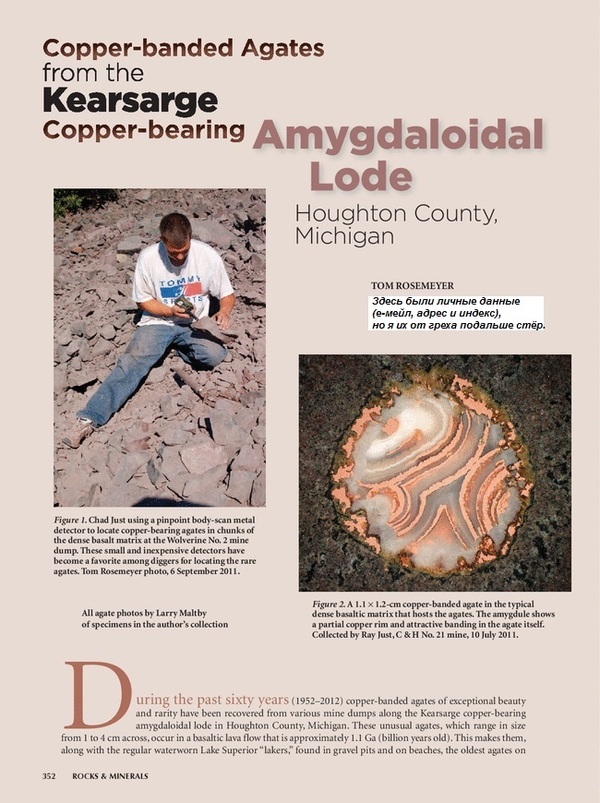 Tom Rosemeyer уроженец Верхнего Мичигана, выпускник Мичиганского технологического университета. В основном он изучал и описывал минералогию двух штатов: Колорадо и Мичиган. Описывая Мичиган, он естественно не забыл и о "медных агатах" и в июле 2012 года он написал статью о Copper Banded Agates в журнале "Rocks & Minerals" в томе 86, выпуске 4. В интернете я нашёл даже статью из этого журнала, вот только доступ к ней платный - 15$ доступ на 30 дней ко всему выпуску, 42$ доступ на 24 часа к только этой статье. Где логика - не знаю, можете посмотреть сами: http://www.tandfonline.com/doi/abs/10.1080/00357529.2012.690....