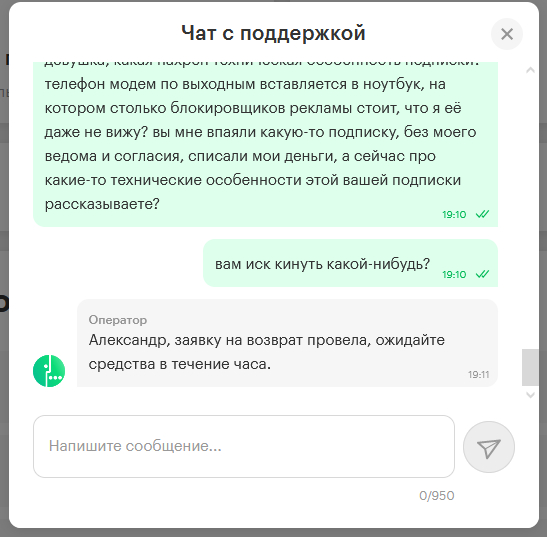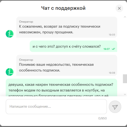 В конце месяца внёс ежемесячную абонентскую плату за сим-карту в модеме, который находится в деревне. Приехал, нет интернета. Полез в ЛК, там подключена услуга, какое-то эро-видео или что-то типа того. Подключена в будние дни, когда модем спокойно лежит в тумбочке и воткнуть его некуда даже. Списана абонетская плата за 1 день (35 ₽ в день). Собственно на эти 35 ₽ и нахожусь в минусе, услуги приостановлены. Далее краткая переписка с техподдержкой. Умиляет попытка в наглую развести. Деньги справедливости ради скажу вернули.
