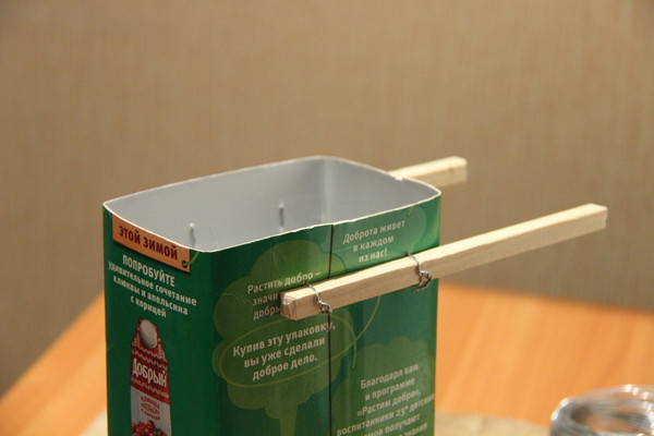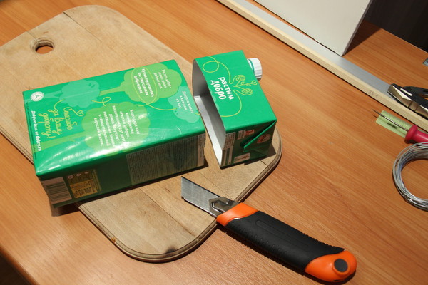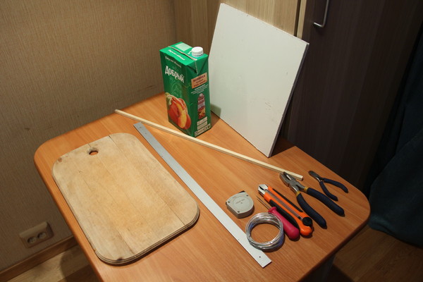 Материалы и инструменты – тут все просто и понятно. 2-литровая коробка из-под сока. Белый лист на фото – обрезок пластика для отделки оконных откосов. Палочка – штапик из хозяйственного. Проволока – любая, достаточно крепкая и мягкая (у нас – стальная, из магазина для поделок).