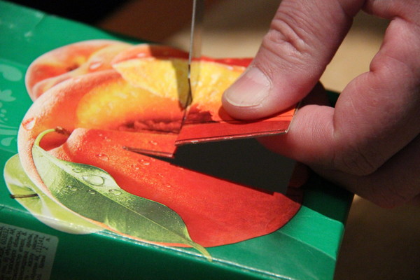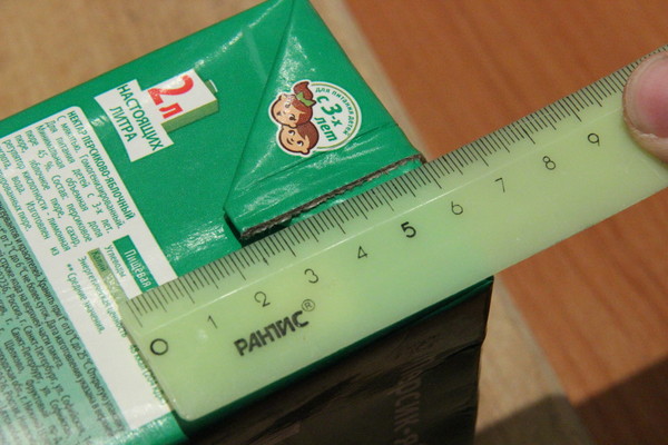 Отмеряем от верха коробки примерно 6 см и отрезаем верх строительным ножом. У такого ножа широкое лезвие, поэтому им удобно резать и без линейки. Не расстраивайтесь, если не получится отрезать ровно – здесь это не обязательно.