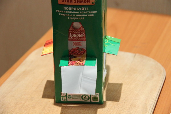 Окна проще сделать прямоугольными. Сверху не забудьте сделать козырьки, отогнув часть окна наружу, тогда кормушку будет меньше заливать во время оттепелей. Нижний вырез лучше сделать повыше - не меньше 2 см от дна коробки.