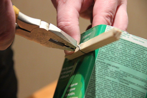 К верхней части коробки, отступив 2 см от верхнего среза, приделываем рейки, на которых вся конструкция и будет крепиться, например, к перилам балкона. Для этого примеряем и отрезаем рейки нужного размера, прокалываем шилом в коробке по 2 пары отверстий с каждой стороны, отрезаем по 8-9 см проволоки, сгибаем ее плоскогубцами буквой П, продеваем изнутри в проколотые дырки, обматываем вокруг рейки и перекручиваем плоскогубцами. Перекрутить надо посильнее, чтобы проволока вдавилась в рейку, тогда рейка не выскользнет; но не слишком сильно, а то проволока порвется. Концы проволоки загибаем вниз.