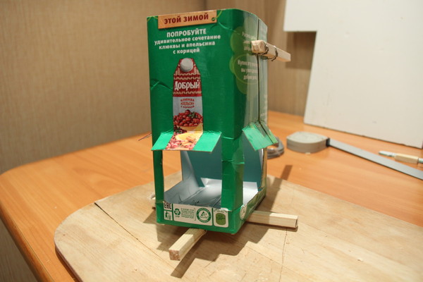 Переворачиваем вверх дном коробку и тем же способом крепим рейки, на которые будут садиться птицы. Здесь важно не делать их слишком длинными (выступ за края коробки - не больше 3 см), иначе на них садятся голуби.