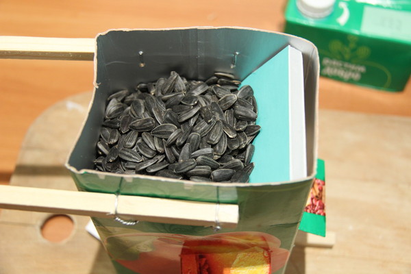 Здесь важно не переборщить с глубиной этого выреза – если сделать его широким, то весь запас семечек быстро съедет вниз, если слишком узким, то они будут застревать. Поэтому можно сначала сделать вырез поменьше, а после испытания, при необходимости, увеличить – перегородка в готовой кормушке ничем не закрепляется и вынимается свободно.