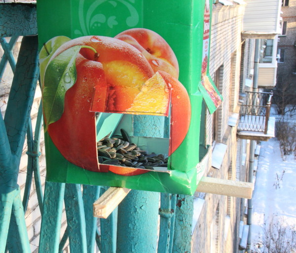 Её можно сделать из любого материала, лишь бы он не прогибался, не промокал и был достаточно гладким – по нему должны съезжать семечки/корм. В прошлом году мы делали ее из картона, обмотанного скотчем, ничего, сезон выдержала.