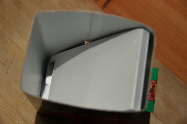 Вставляем перегородку и, немного сжав верх коробки, надеваем крышку. Можно насыпать корм и проверить работу дозатора.
