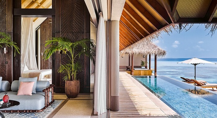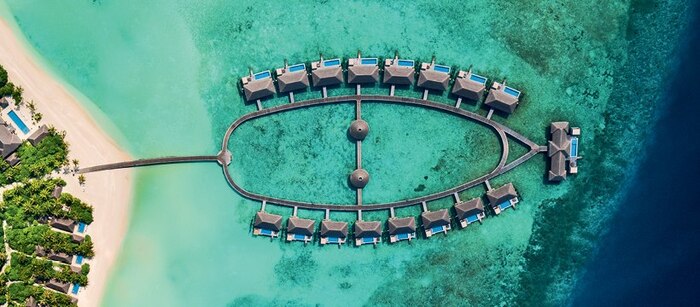 В качестве примера беру Sun Siyam Iru Fushi - 45 мин на гидросамолете от Мале - 220 номеров, 560 сотрудников. 11 расторанов-баров. 3 общественных бассейна и 154 в номерах. Размер острова 800x300.