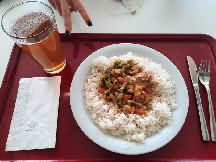 На обед предлагаются - кусочки курицы в красном соусе карри, с морковью, паприкой, колбасой пепперони, рис Жасмин и листья салата (на фото их нет, потому что ученик их не захотел)
